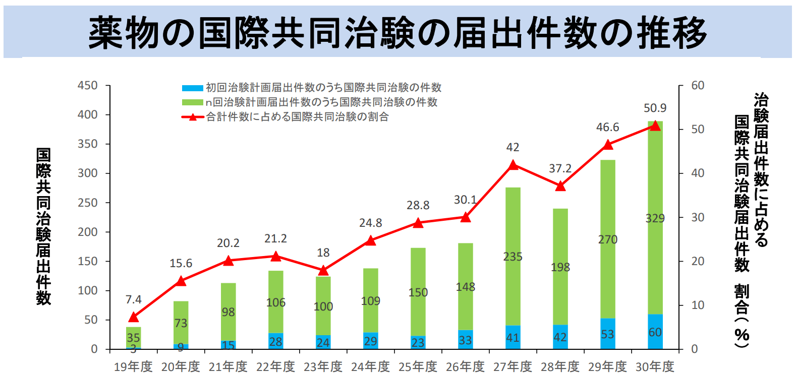 国際共同治験とは、1つの治験に複数地域の医療機関が参加し、同時並行で開発・申請・承認を目指す取り組みです。収集できる症例数が多いことから副作用を効果的に見つけやすく、民族ごとの有効性や安全性を評価しやすい点がメリットです。 以下資料から読み取れるように、国際共同治験の届出件数は年々増加しており、これがドラッグ・ラグの解消に貢献していると考えられます。